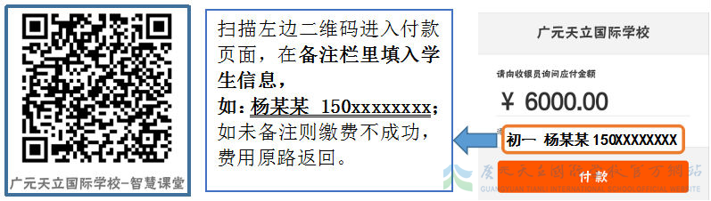 1、通过二维码扫码缴费,付款时请一定备注学生姓名、家长电话。