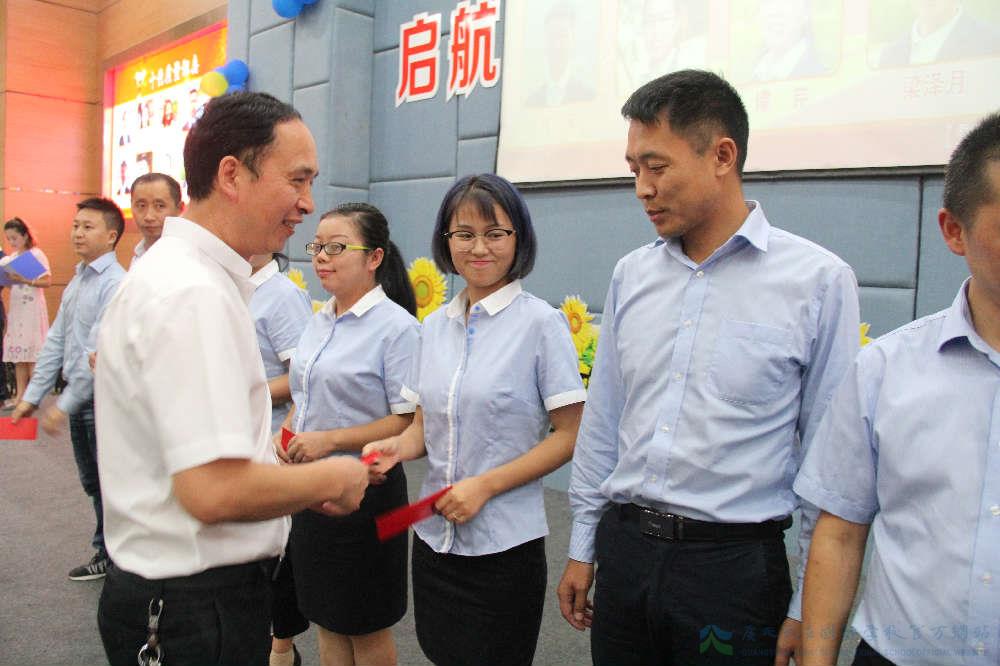 会上,黄永贵总校长激情致辞。他对过去三年学校发展的光辉历程进行了简要回顾,向今年新加盟广元天立的新老师表示热忱欢迎,向过去三年为学校建设与发展做出卓越贡献的全体教职工致以崇高敬意,向全校教职员工致以诚挚的问候和节日的祝福,并对学校三年来在校园建设、队伍建设、特色打造、质量建设、后勤服务方面特别是今年中高考取得的辉煌成绩进行了全面总结,对新学年学校各项工作提出了新要求,他希望全体教师自觉汲取中国传统教育思想中的精华,提升自己的传统文化素养与施教能力,承担起历史赋予的重大使命,早日把广元天立办成一所川陕甘结合部的区域名校,办成一所地级城市综合教育改革的示范校,办成天立教育集团的标杆学校,办成一所受人尊重令人向往的学校,办成一所让师生充满幸福感、自豪感、尊严感的学校。