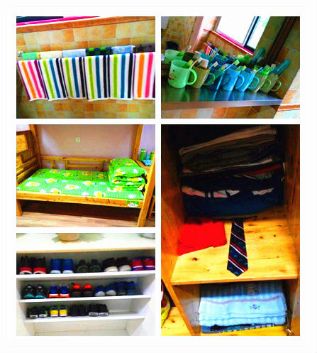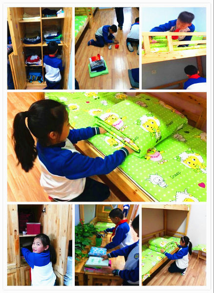 活动开始,孩子们排着整齐的队伍,在生活老师的带领下回到宿舍。到了宿舍以后,他们就在生活老师的指导下开始整理内务,衣柜、鞋柜、洗脸台、床铺,每一个孩子都整理的认认真真,整理过的地方,也变得整整齐齐。