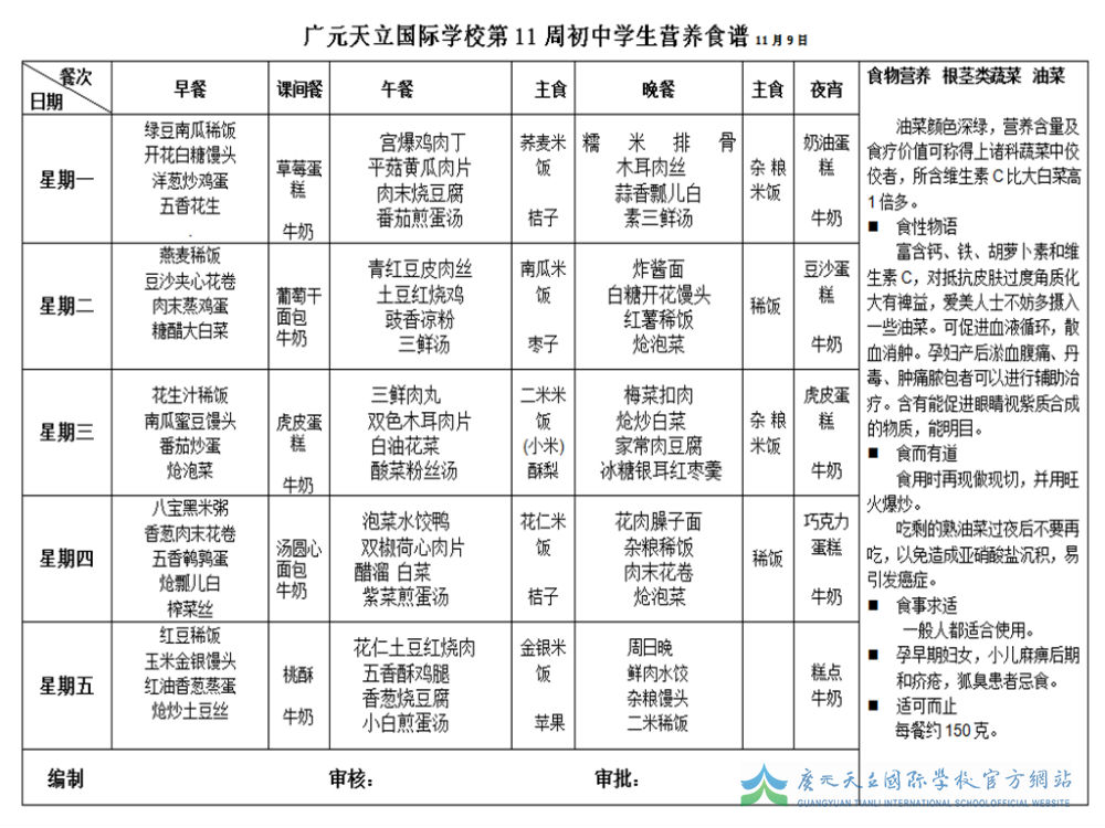 广元天立国际学校第11周初中学生营养食谱11月9日